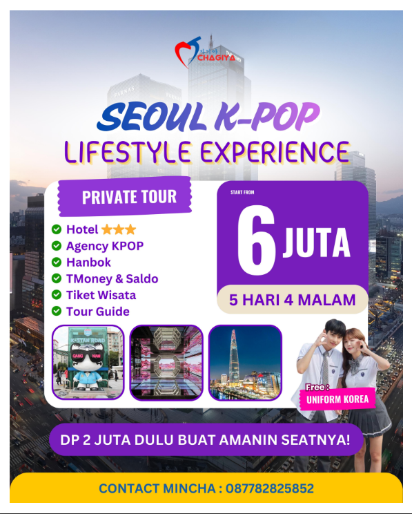 Calling for KPopers yang ingin jalan-jalan ke Korea sambil napak tilas tempat bias kalian, yuk ambil paket ini barengan kawan-kawan fangirling atau fanboy-an di Korea. Siapa tau bisa ketemu sama bias kalian><. Jadwal flexible bisa menyesuaikan dengan wishlist kalian. Asyiiik kan? Mau berkunjung ke Agency YG, Hybe, JYP, SM Ent, dll atau mau hunting merchandise pas ultah bias? Bisa banget…. Yuk kontak kita segera di link ini yaaaa